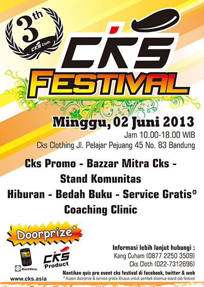 CKS Festival Minggu, 2 Juni 2013 CKS Promo – Bazar Mitra CKS – Stand Komunitas – Hiburan – Bedah Buku – Service Gratis – Coaching Clinic